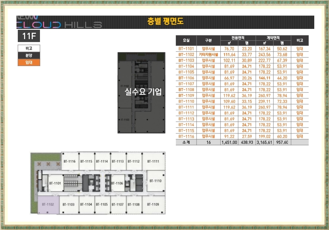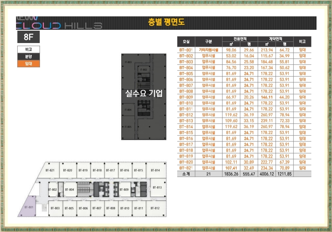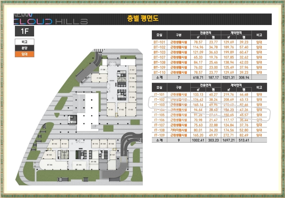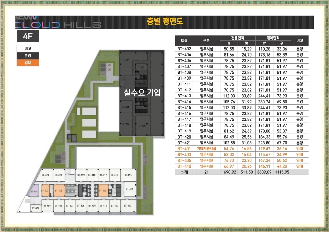 마곡 뉴브 클라우드힐스는 IT동과 BT동 2개의 동으로 구성되어 있으며 IT동은 우미건설을 비롯한 현대건설,광동제약,대아티아이,에코네트워크 등 실수요 업체들이 입주하며 BT동만 분양을 진행합니다.