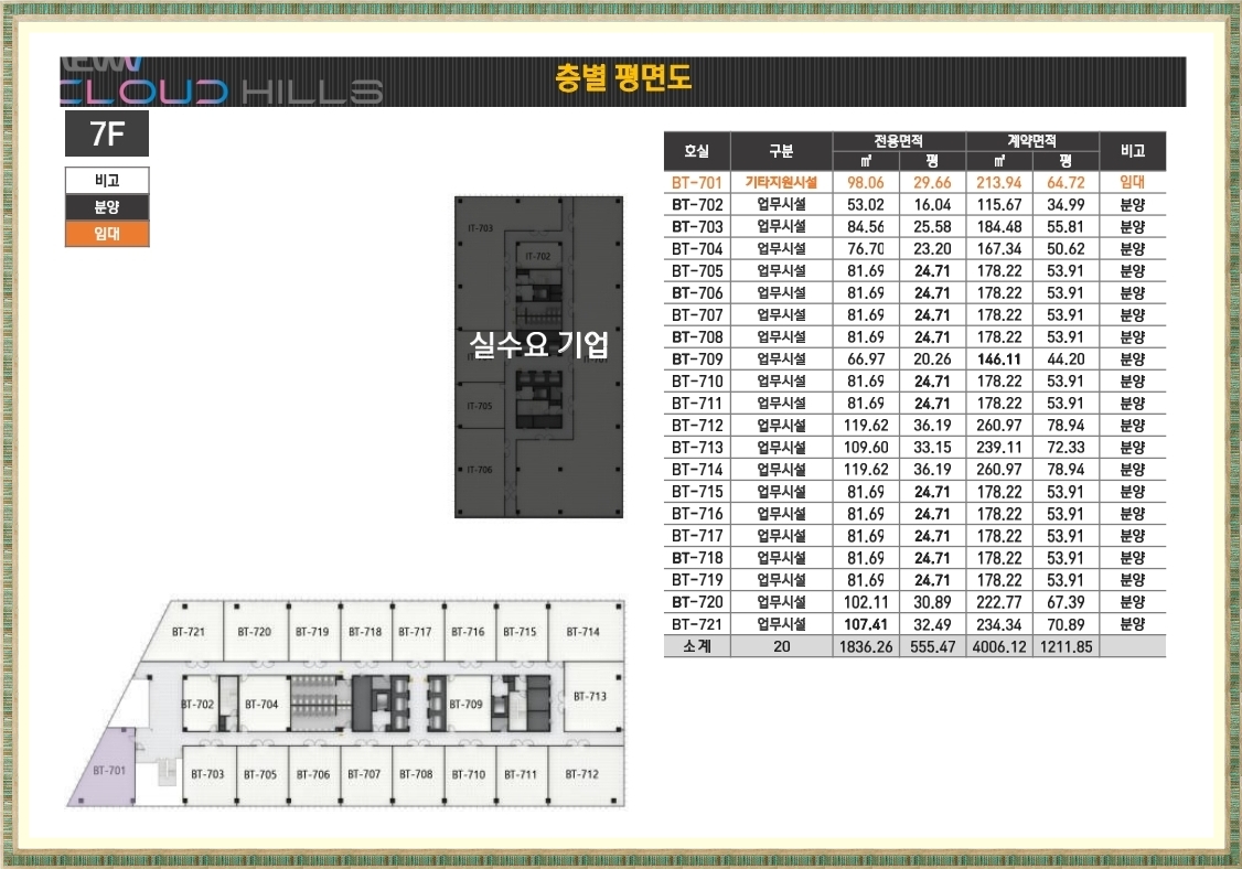 전체 오피스(업무시설)와 함께 업무지원시설, 근린생활시설로 구성되며 업무시설은 총 272실로 이 가운데 156실이 분양,116실은 임대를 통해 공급됩니다. 근린생활시설은 분양이 아닌 임대로 공급됩니다.