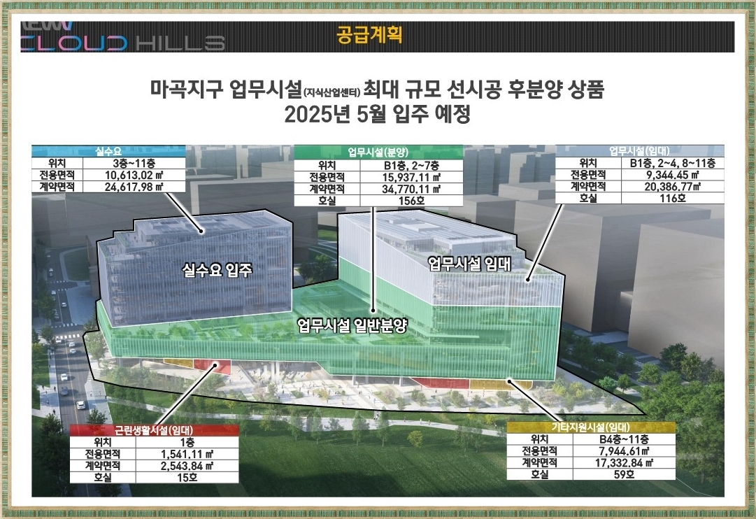 마곡 뉴브 클라우드힐스는 서울 강서구 마곡지구 산업단지 내에 공급되는 업무시설로 서울시 강서구 마곡동 779-1번지 일원( 마곡산업시설구역 13블록)에 지하4층~지상 11층, 연면적 99,651㎡ 규모로 지어지며 2025년 5월 입주예정입니다.