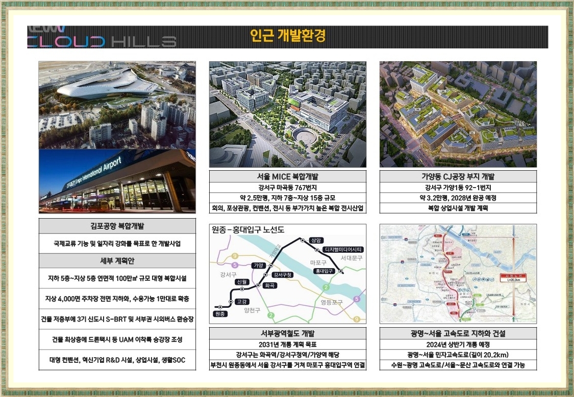 마곡 뉴브 클라우드힐스가 입지하는 마곡업무지구는 기존 CBD,YBD,GBD와 달리 첨단산업 클러스터를 조성하고 업무단지와 배후 주거단지가 잘 개발되어 있어 주거,업무,문화시설,자연환경,컨벤션 등이 공존하는 제4의 업무지구로 평가 받고 있으며 9호선 양천 향교역 초역세권으로 업무연계가 가능한 요충지이기도 합니다.