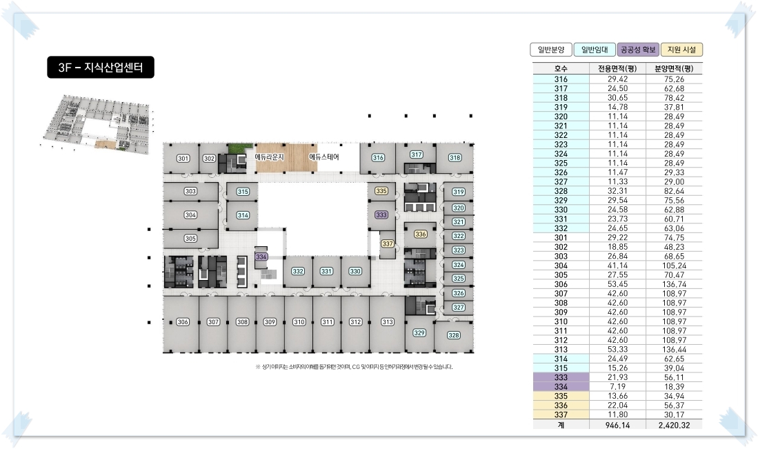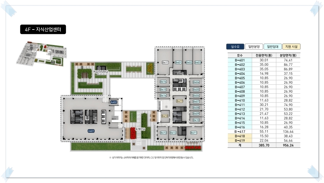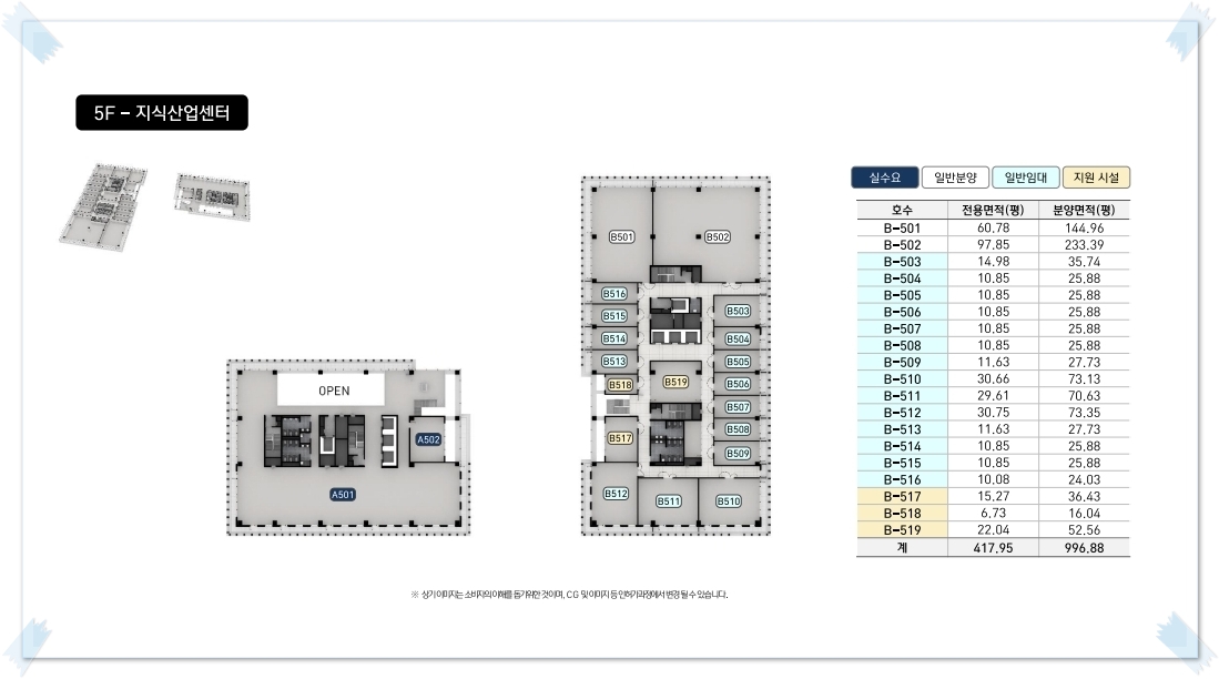 또한 아이파크 브랜드의 지식산업센터인 만큼 중정 구조를 통해 우수한 채광성을 확보하였으며, 홍보전시실, 메이커 페이스, 공용회의실 등을 조성하여 상품성 또한 우수합니다.