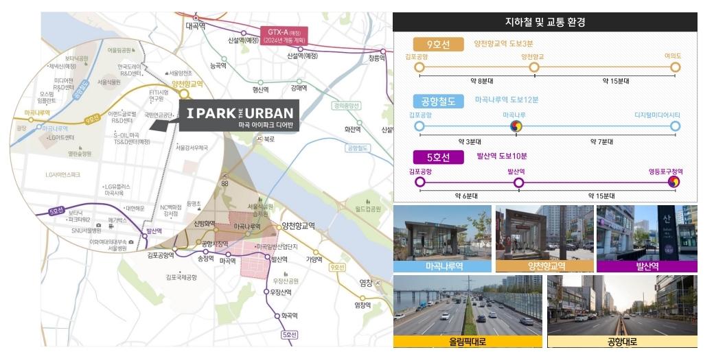 아울러 마곡 아이파크디어반은 최적의 비즈니스 교통망을 갖추고 있습니다. 지하철 9호선 양천향교역에서 300m, 도보 3분 초역세권으로 탁월한 교통 접근성을 자랑합니다. 여기에 더해 5호선 발산역과 공항철도 마곡나루역까지 인접해 있어 서울 도심은 물론 수도권 전역을 아우르는 뛰어난 광역 교통망이 구축되어 있습니다.