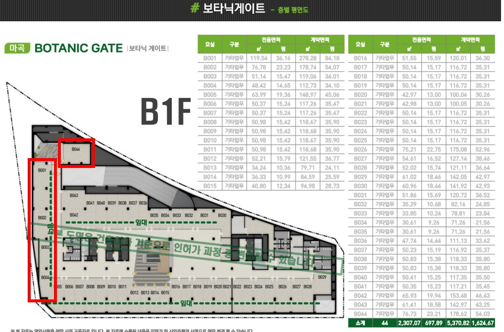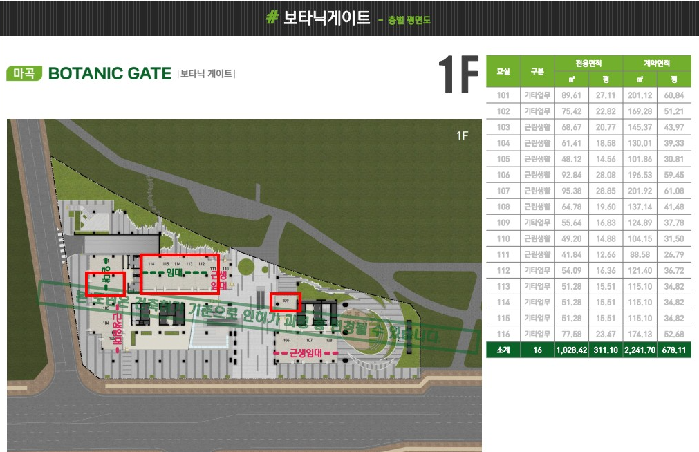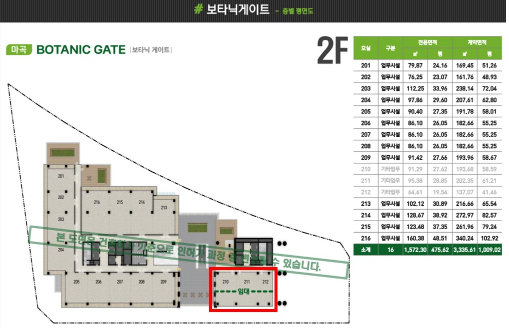 210호~212호는 1층 스타벅스 바로 위층으로 전면에 서울식물원과 보타닉 공원 전망뷰로 임대료는 4만원입니다.
